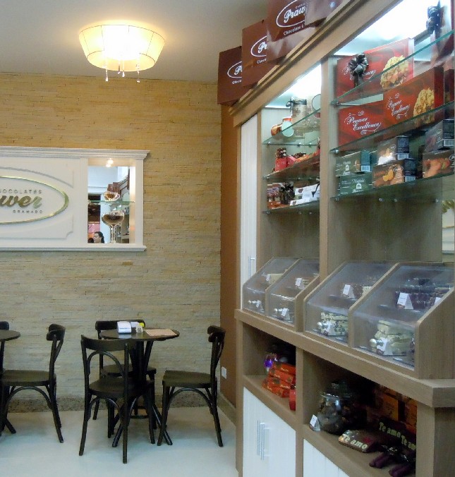 O projeto arquitetônico da Prawer Paseo segue a mesma orientação visual das outras lojas Prawer no Brasil, que elege o branco, o creme e o areia para compor um espaço bem iluminado. Para atender ao café, mesas e cadeiras em madeira escura que contrastam com o ambiente claro. A parede de fundo das áreas de preparo exibem um alegre mosaico de pastilhas em marrom, caramelo e branco. E a parede de tijolo palito em tom areia acrescenta ainda mais charme, com o logotipo dourado da marca entre duas pequenas vitrines de exposição de chocolates.